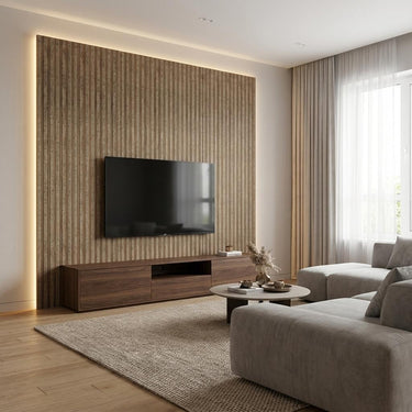 Louvers constructed with Polystyrene core and Wood, finished in matte Tan brown. Delivers a textured modern look suitable for accent walls.