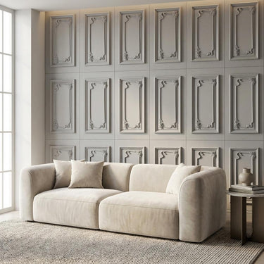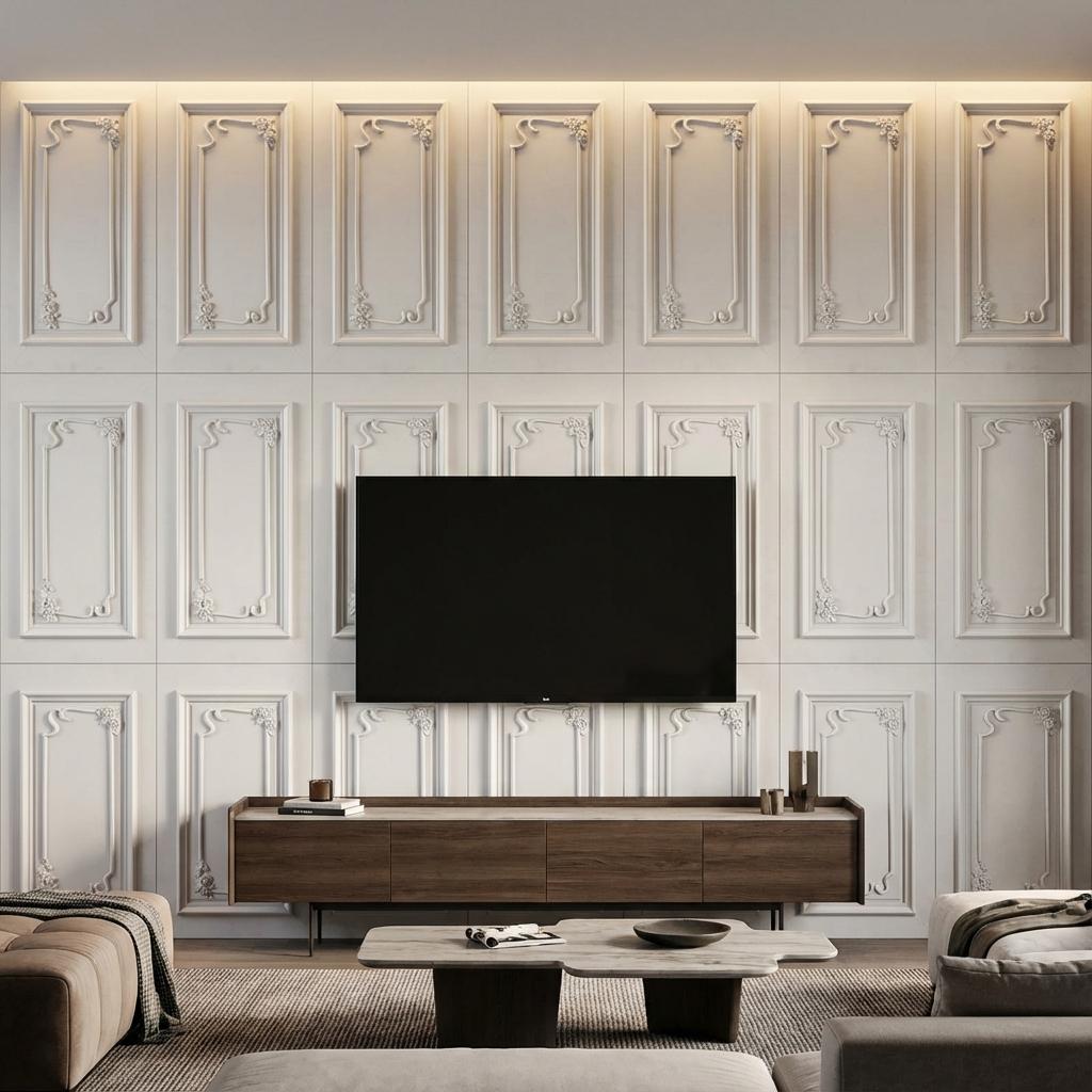 PU Panels constructed with PU core and 3D Cornice, finished in matte White. Delivers a textured modern look suitable for accent walls.