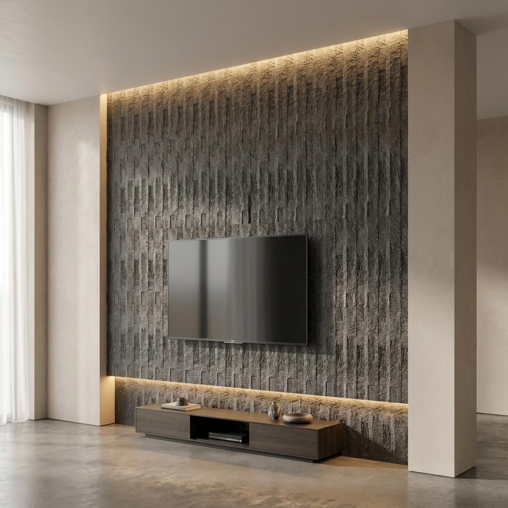 Stone Cladding constructed with PVC core and 3D Stone, finished in matte Multi-colour. Delivers a textured modern look suitable for accent walls.