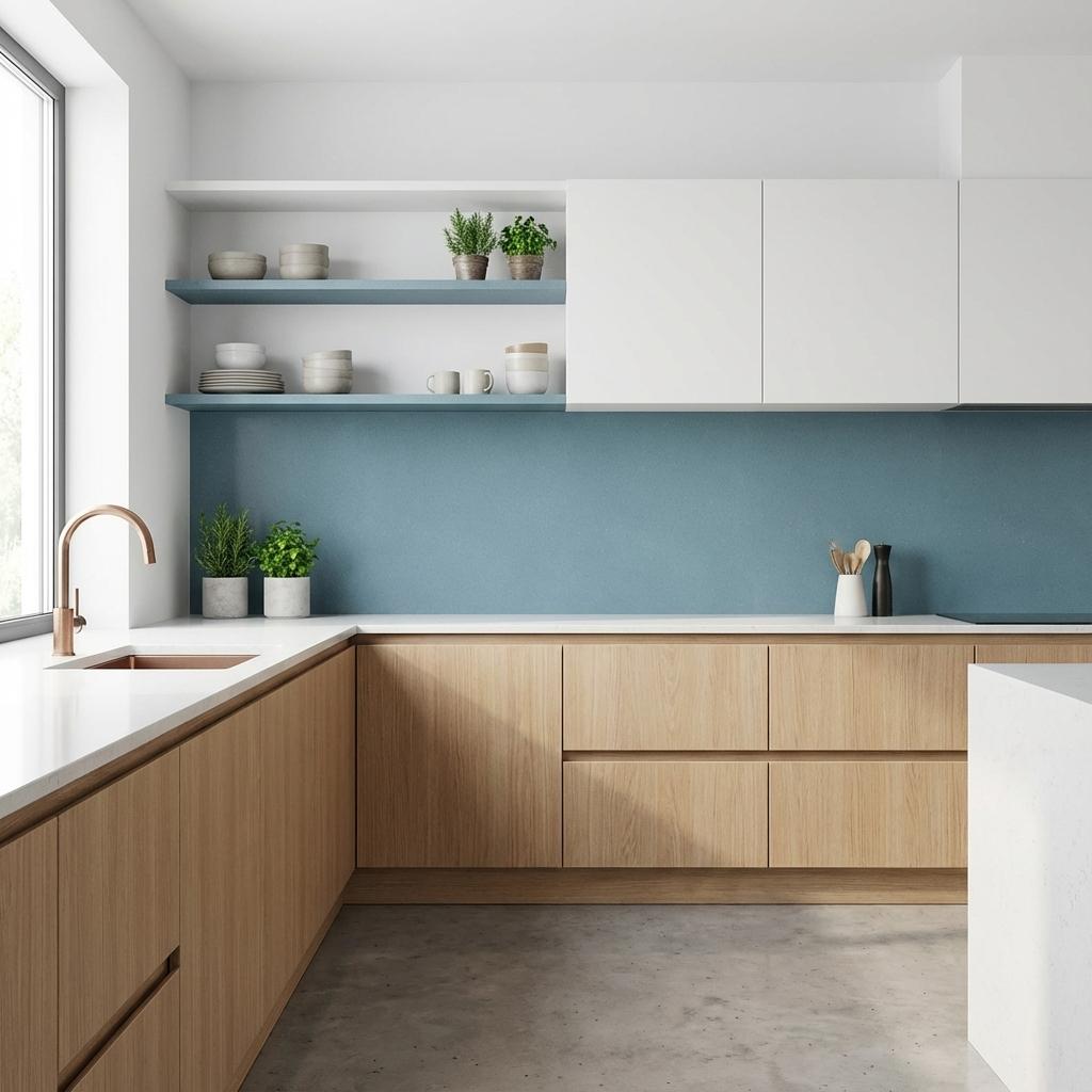 Surprising blue minimalism—neutral that listens while bringing gentle personality. Canvas for those seeking sophistication with soul. Made from refined clay, quartz/silica, and feldspar fired at high temperature to create a dense, low‑porosity body with color and pattern running through the entire thickness for superior wear and chip camouflage.