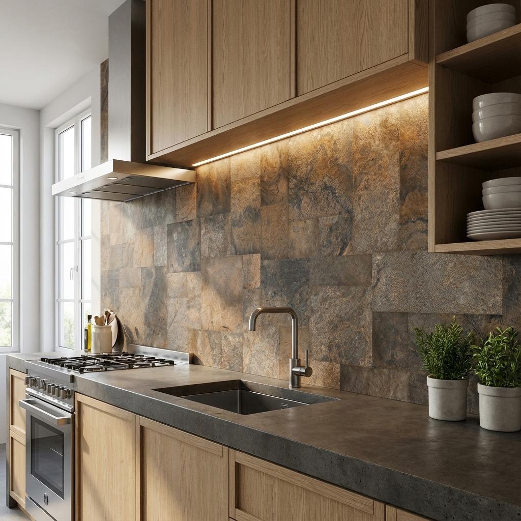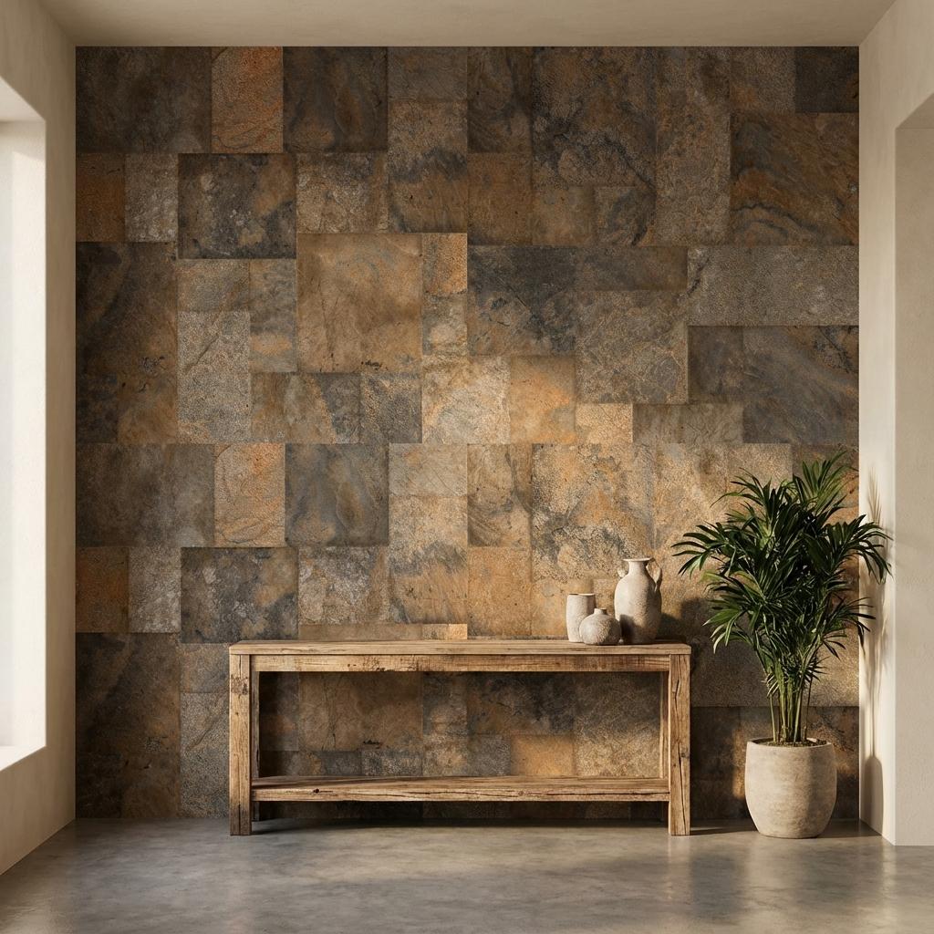 Rich brown surfaces combining warm vision with tactile sophistication. Expert treatments celebrating natural character. Made from refined clay, quartz/silica, and feldspar fired at high temperature to create a dense, low‑porosity body with color and pattern running through the entire thickness for superior wear and chip camouflage.