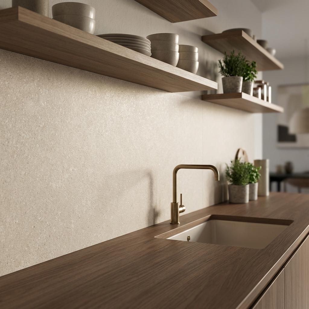 Sun-bleached beige stone whispers Mediterranean quarries and ancient pilgrimage routes. Textured surfaces tell stories of natural weathering. Made from refined clay, quartz/silica, and feldspar fired at high temperature to create a dense, low‑porosity body with color and pattern running through the entire thickness for superior wear and chip camouflage.