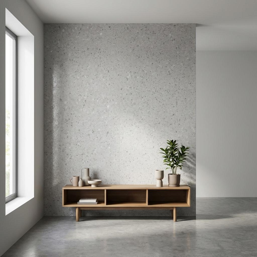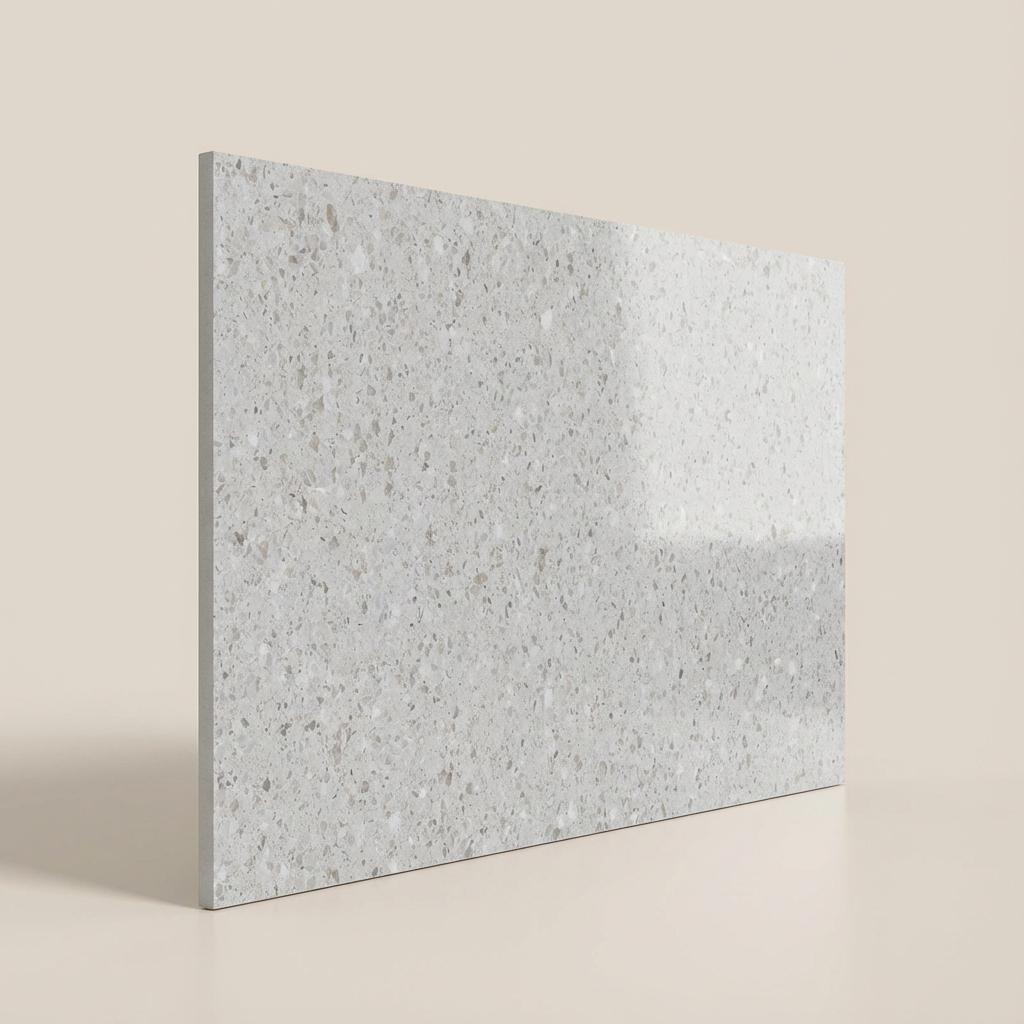Ancient Rome rendered in soft light grey—hand-selected marble fragments creating serene patterns through gentle, contemporary elegance. Made from refined clay, quartz/silica, and feldspar fired at high temperature to create a dense, low‑porosity body with color and pattern running through the entire thickness for superior wear and chip camouflage.