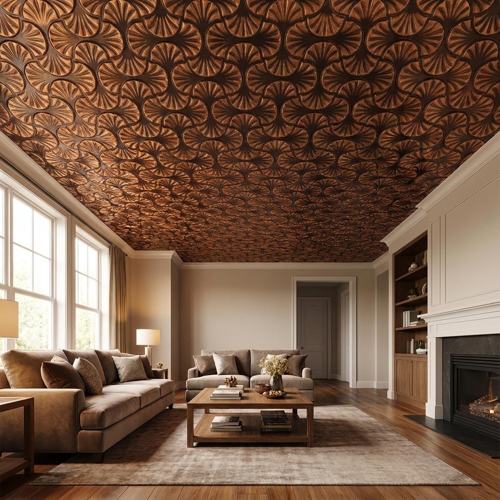 Aged Antique Copper features luxurious metallic finishes for contemporary interiors. This sophisticated PVC ceiling panel combines stunning visual appeal with practical durability, using advanced printing technology to create authentic metallic effects with impressive depth. The glossy finish beautifully reflects light, perfect for modern elegance. Ideal for statement-making spaces, this panel delivers exceptional quality with water resistance, easy maintenance, and remarkable longevity.