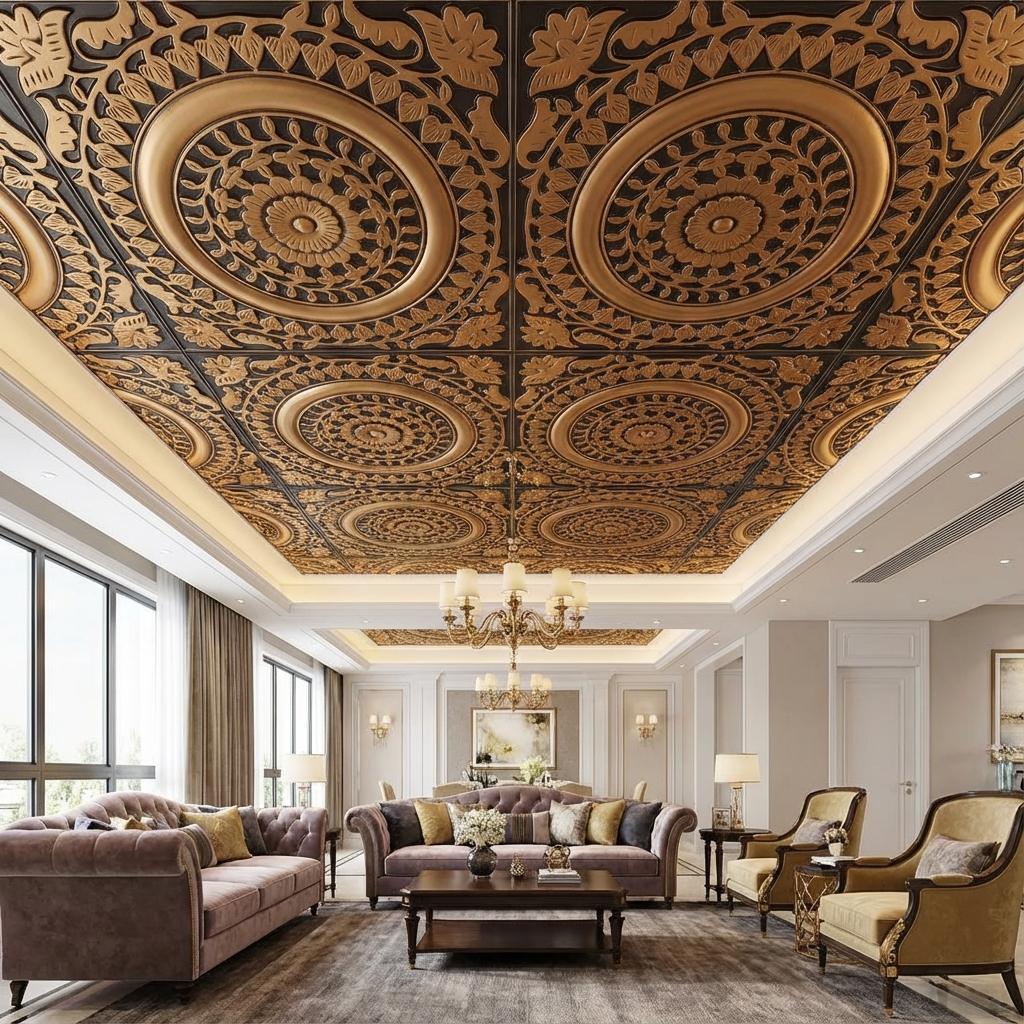 Antique Antique Copper features luxurious metallic finishes for contemporary interiors. This sophisticated PVC ceiling panel combines stunning visual appeal with practical durability, using advanced printing technology to create authentic metallic effects with impressive depth. The glossy finish beautifully reflects light, perfect for modern elegance. Ideal for statement-making spaces, this panel delivers exceptional quality with water resistance, easy maintenance, and remarkable longevity.