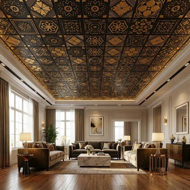 Antique Gold Shine features luxurious metallic finishes for contemporary interiors. This sophisticated PVC ceiling panel combines stunning visual appeal with practical durability, using advanced printing technology to create authentic metallic effects with impressive depth. The glossy finish beautifully reflects light, perfect for modern elegance. Ideal for statement-making spaces, this panel delivers exceptional quality with water resistance, easy maintenance, and remarkable longevity.