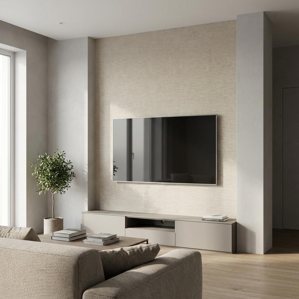 Clay Panels constructed with Clay core and 3D Stone, finished in matte Off-White. Delivers a textured modern look suitable for accent walls.