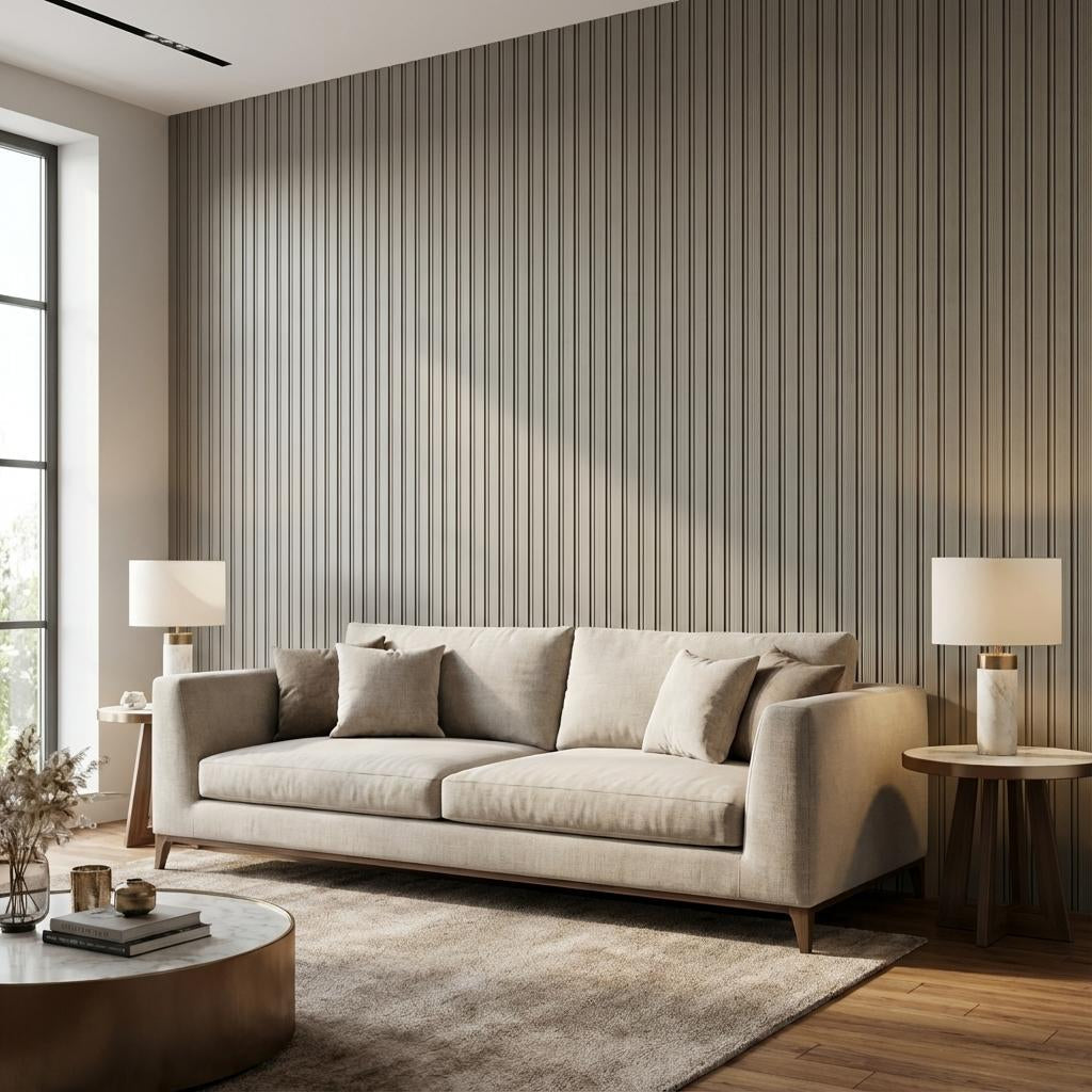 Louvers constructed with MDF core and Fabric - Linen, finished in linen Multi-colour. Delivers a linen modern look suitable for accent walls.