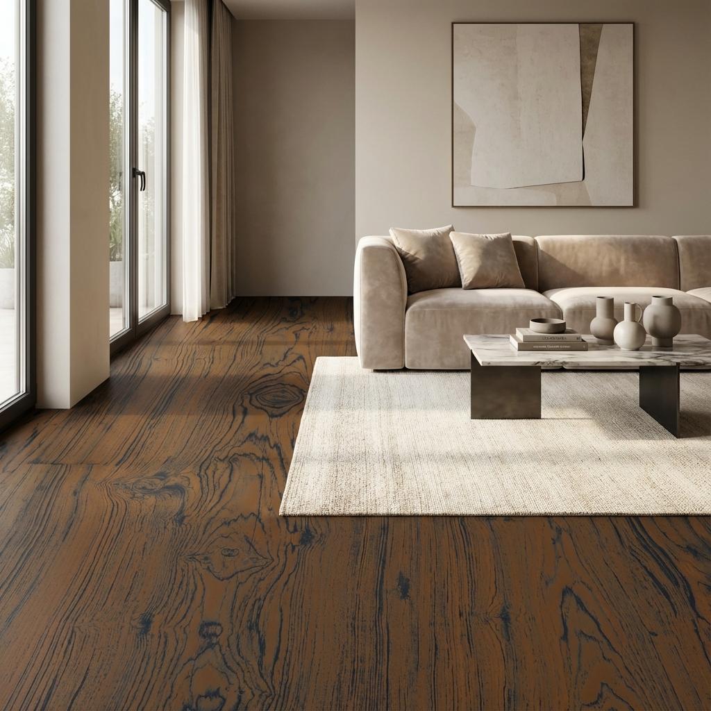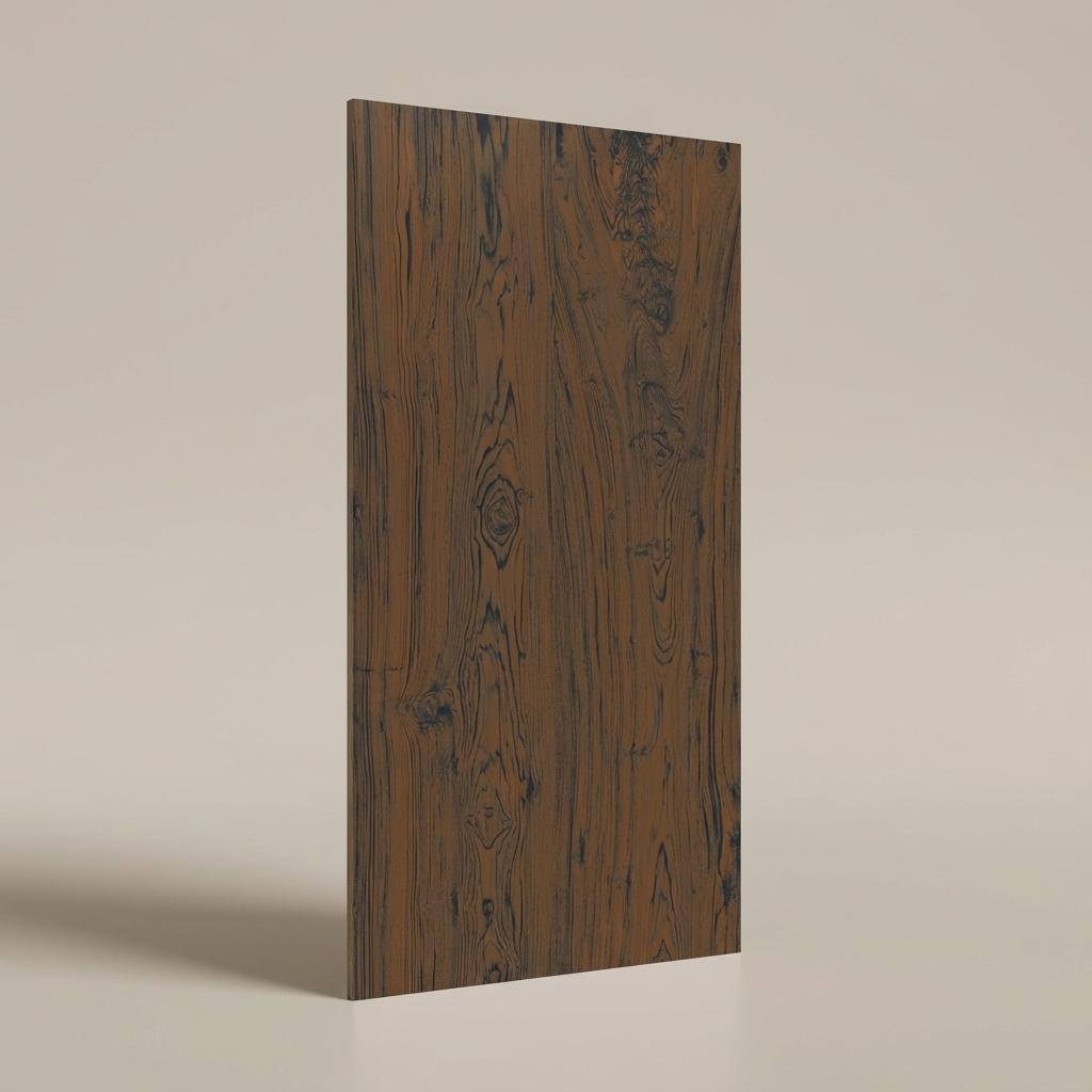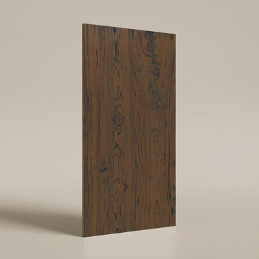 Wood's organic beauty elevated in dark—all romantic richness, none of maintenance or aging concerns. Made from refined clay, quartz/silica, and feldspar fired at high temperature to create a dense, low‑porosity body with color and pattern running through the entire thickness for superior wear and chip camouflage.