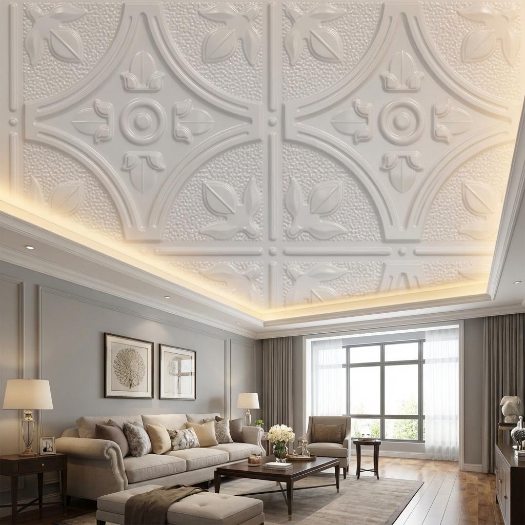 Silk Minimal Paintable - Baali Botanical - White - Decorative Ceiling Panel - 2 ft x 2 ft