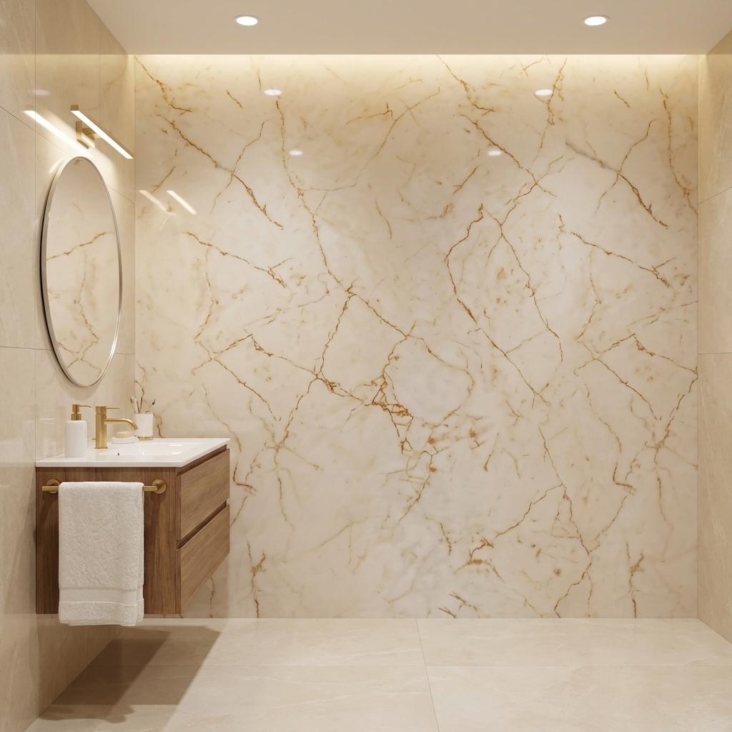 From Brescia quarries—warm beige with subtle caramel veining. True luxury whispers for sophisticated connoisseurs. Made from refined clay, quartz/silica, and feldspar fired at high temperature to create a dense, low‑porosity body with color and pattern running through the entire thickness for superior wear and chip camouflage.