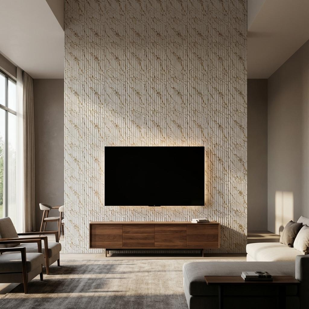 Louvers constructed with PVC core and Marble, finished in glossy Golden White. Delivers a glossy modern look suitable for accent walls.