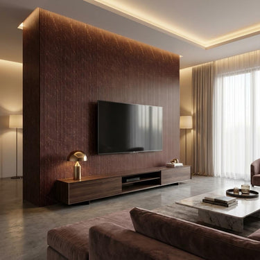 Louvers constructed with PVC core and Marble, finished in matte Maroon. Delivers a textured modern look suitable for accent walls.
