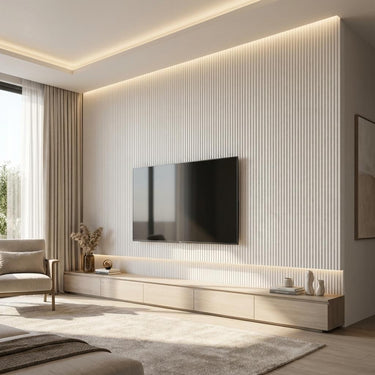 Louvers constructed with Polystyrene core and Fabric - Linen, finished in linen Multi-colour. Delivers a linen modern look suitable for accent walls.