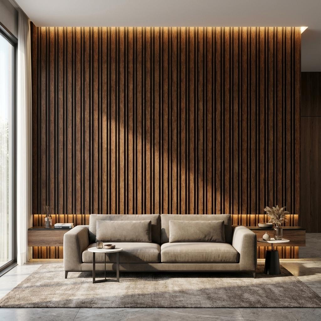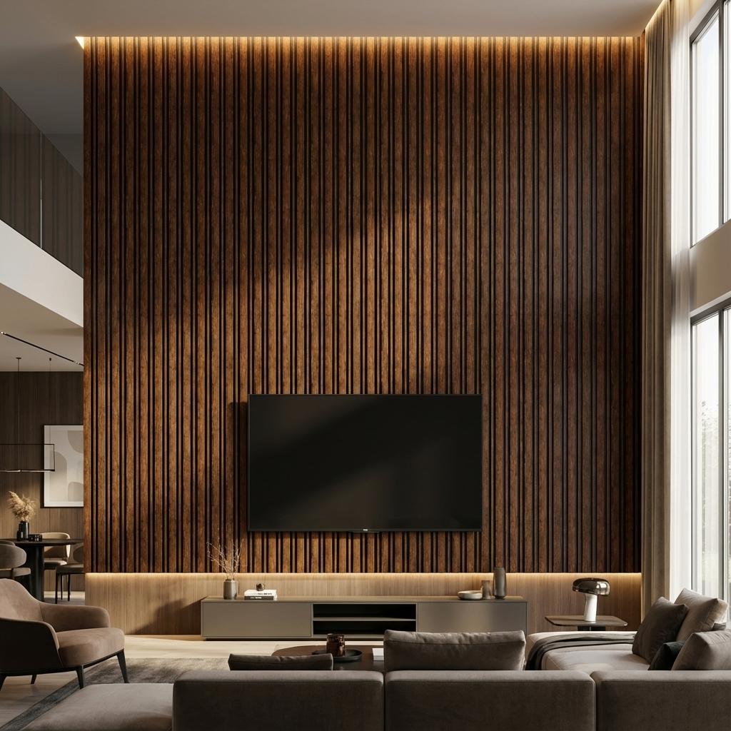 Louvers constructed with Polystyrene core and Wood, finished in matte Multi-colour. Delivers a textured modern look suitable for accent walls.