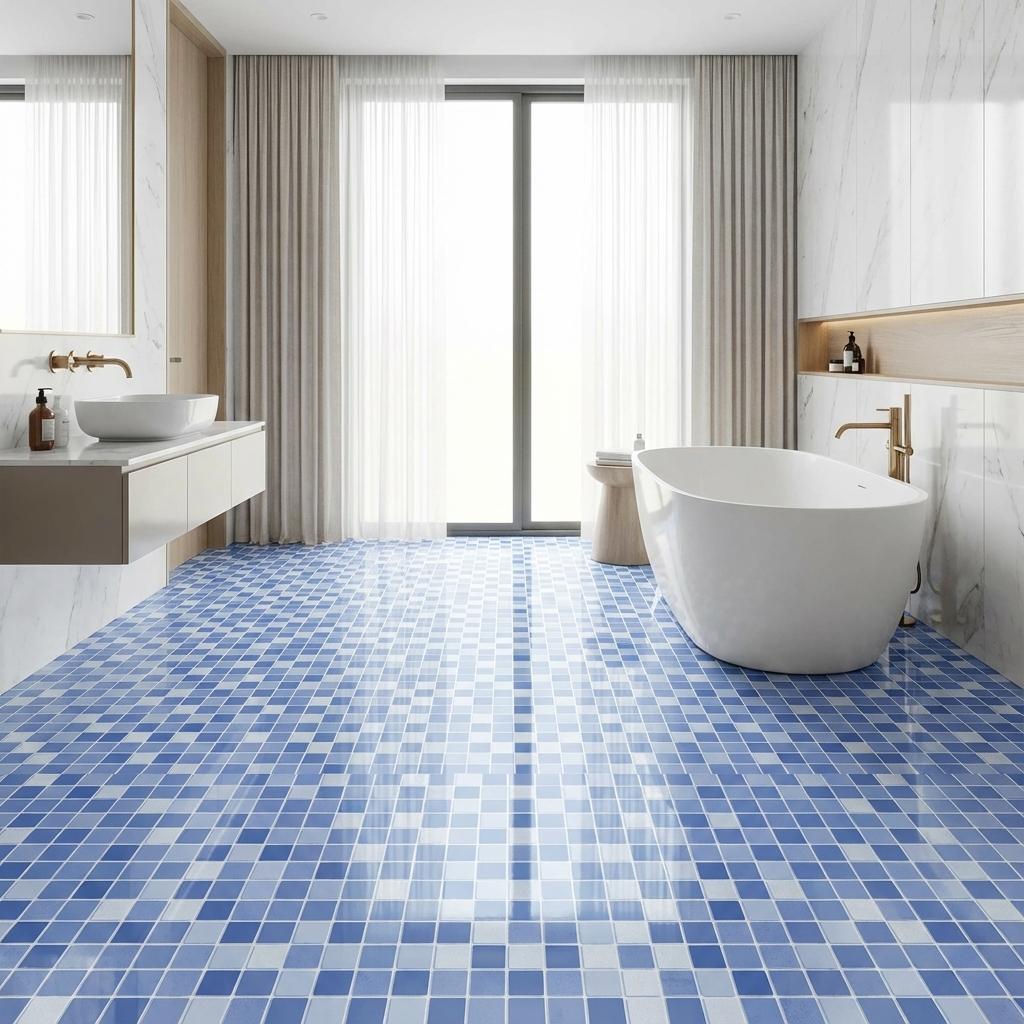 Soul of Moroccan zellij—hand-cut, hand-glazed fragments in ethereal blue. Each piece is brushstroke in centuries-old mathematics-art conversation. Made from refined clay, quartz/silica, and feldspar fired at high temperature to create a dense, low‑porosity body with color and pattern running through the entire thickness for superior wear and chip camouflage.