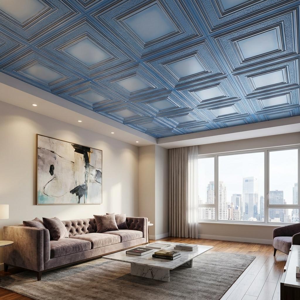 Fusion Blue Dove features luxurious metallic finishes for contemporary interiors. This sophisticated PVC ceiling panel combines stunning visual appeal with practical durability, using advanced printing technology to create authentic metallic effects with impressive depth. The glossy finish beautifully reflects light, perfect for modern elegance. Ideal for statement-making spaces, this panel delivers exceptional quality with water resistance, easy maintenance, and remarkable longevity.