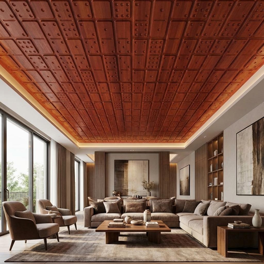 Native Dark Cherry features luxurious metallic finishes for contemporary interiors. This sophisticated PVC ceiling panel combines stunning visual appeal with practical durability, using advanced printing technology to create authentic metallic effects with impressive depth. The glossy finish beautifully reflects light, perfect for modern elegance. Ideal for statement-making spaces, this panel delivers exceptional quality with water resistance, easy maintenance, and remarkable longevity.