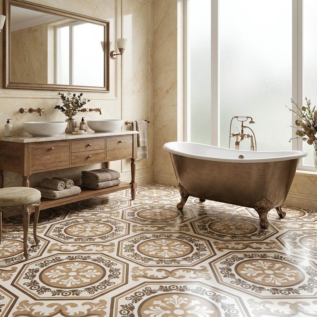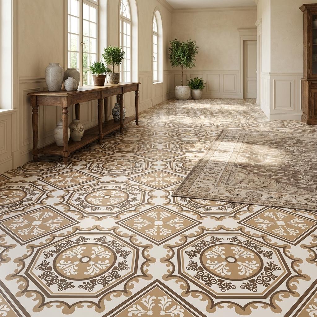 Desert warmth captured in beige—patterns that echo sand dunes and the color of worn palace walls in historic medinas. Made from refined clay, quartz/silica, and feldspar fired at high temperature to create a dense, low‑porosity body with color and pattern running through the entire thickness for superior wear and chip camouflage.