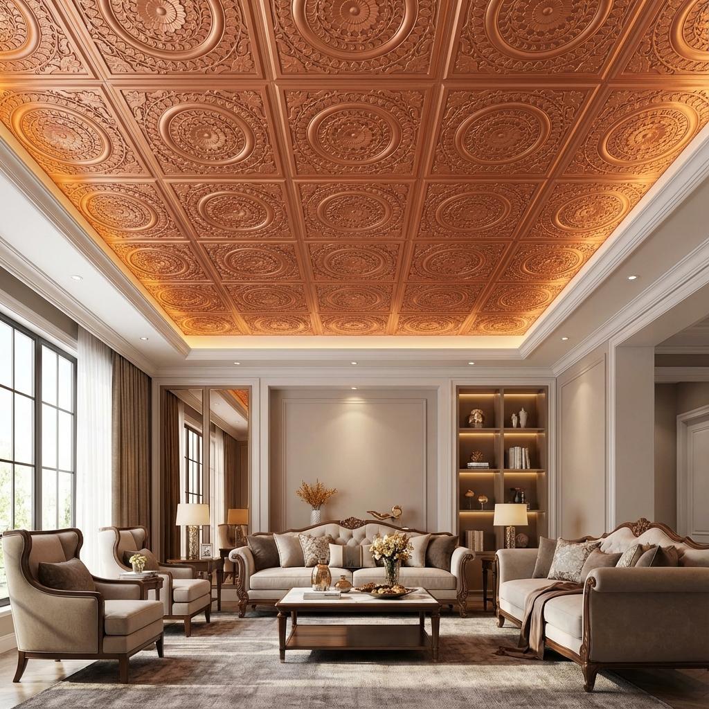 Authentic Copper features luxurious metallic finishes for contemporary interiors. This sophisticated PVC ceiling panel combines stunning visual appeal with practical durability, using advanced printing technology to create authentic metallic effects with impressive depth. The glossy finish beautifully reflects light, perfect for modern elegance. Ideal for statement-making spaces, this panel delivers exceptional quality with water resistance, easy maintenance, and remarkable longevity.