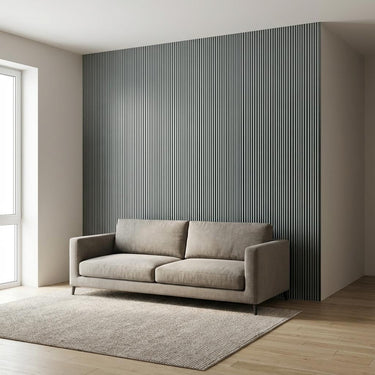 Louvers constructed with Polystyrene core and Stone, finished in matte Grey. Delivers a textured modern look suitable for accent walls.