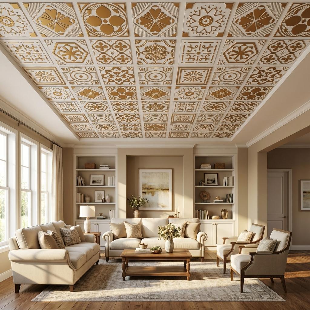 Burnished Antique White - Persian Motifs - White, Beige - Decorative Ceiling Panel - 2 ft x 2 ft