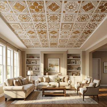 Burnished Antique White features luxurious metallic finishes for contemporary interiors. This sophisticated PVC ceiling panel combines stunning visual appeal with practical durability, using advanced printing technology to create authentic metallic effects with impressive depth. The glossy finish beautifully reflects light, perfect for modern elegance. Ideal for statement-making spaces, this panel delivers exceptional quality with water resistance, easy maintenance, and remarkable longevity.