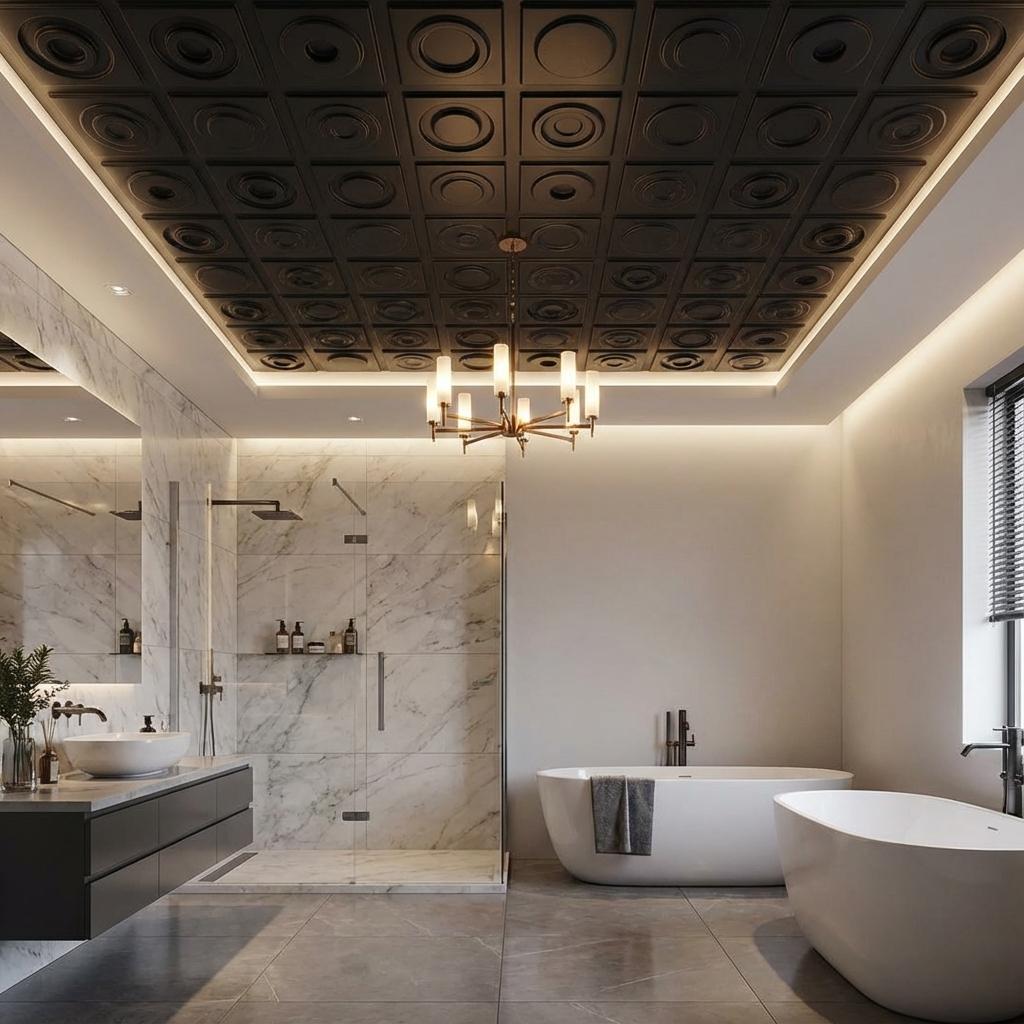 Color Black features luxurious metallic finishes for contemporary interiors. This sophisticated PVC ceiling panel combines stunning visual appeal with practical durability, using advanced printing technology to create authentic metallic effects with impressive depth. The glossy finish beautifully reflects light, perfect for modern elegance. Ideal for statement-making spaces, this panel delivers exceptional quality with water resistance, easy maintenance, and remarkable longevity.