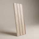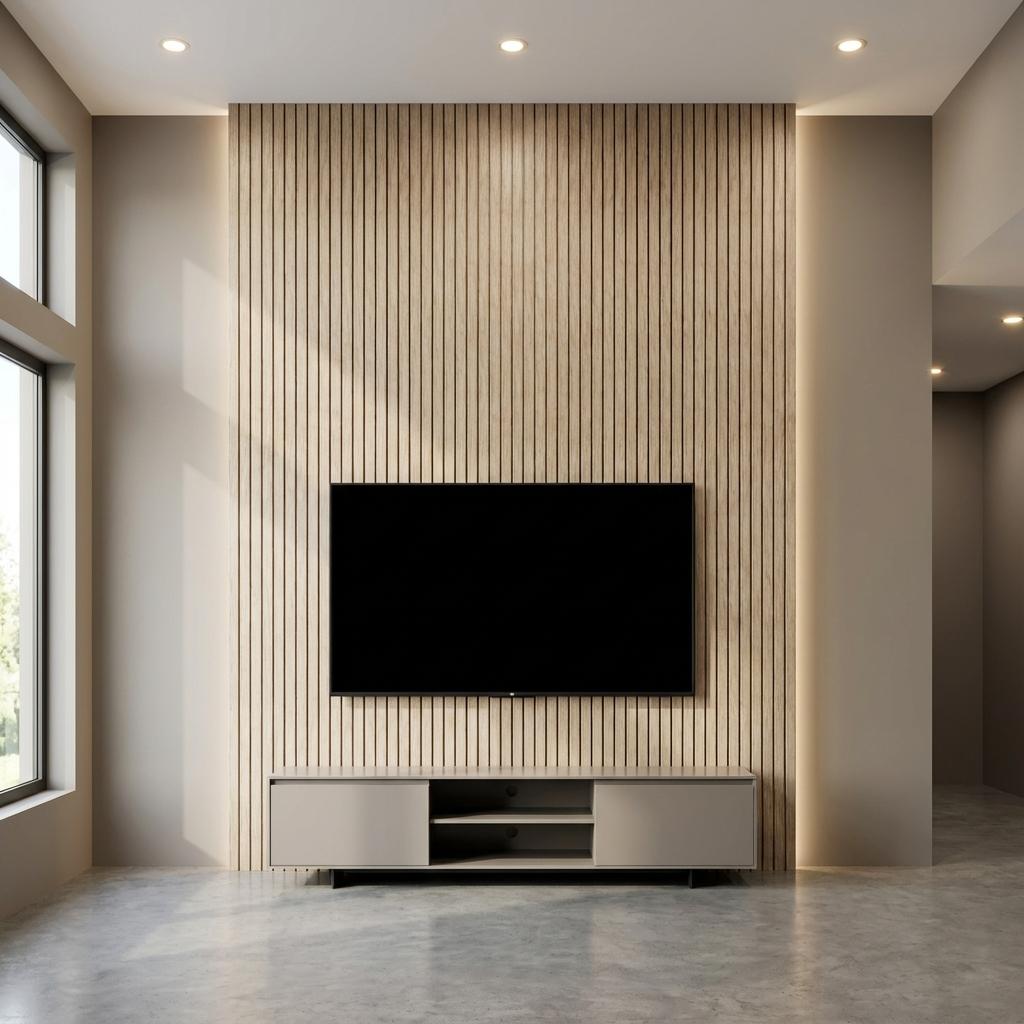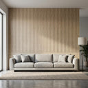 Louvers constructed with Polystyrene core and Wood, finished in matte Oak brown. Delivers a textured modern look suitable for accent walls.