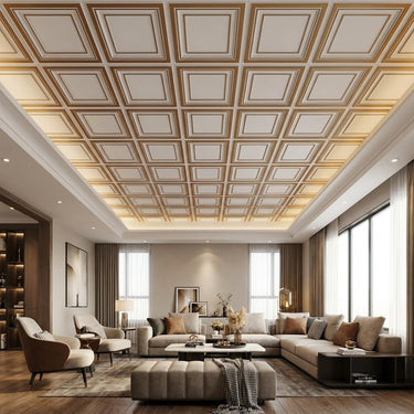 Gleam Antique White - Greek Geometric - White, Beige - Decorative Ceiling Panel - 2 ft x 2 ft