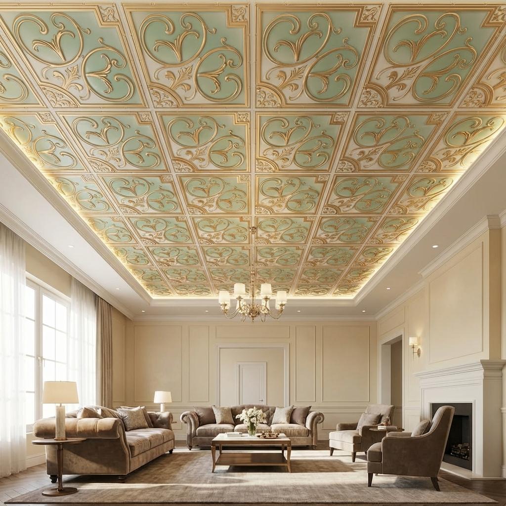 Intense Arabian Green - Baali Botanical - Green, Gold - Decorative Ceiling Panel - 2 ft x 2 ft