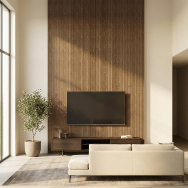 Louvers constructed with PVC core and Marble, finished in matte Brown. Delivers a textured modern look suitable for accent walls.
