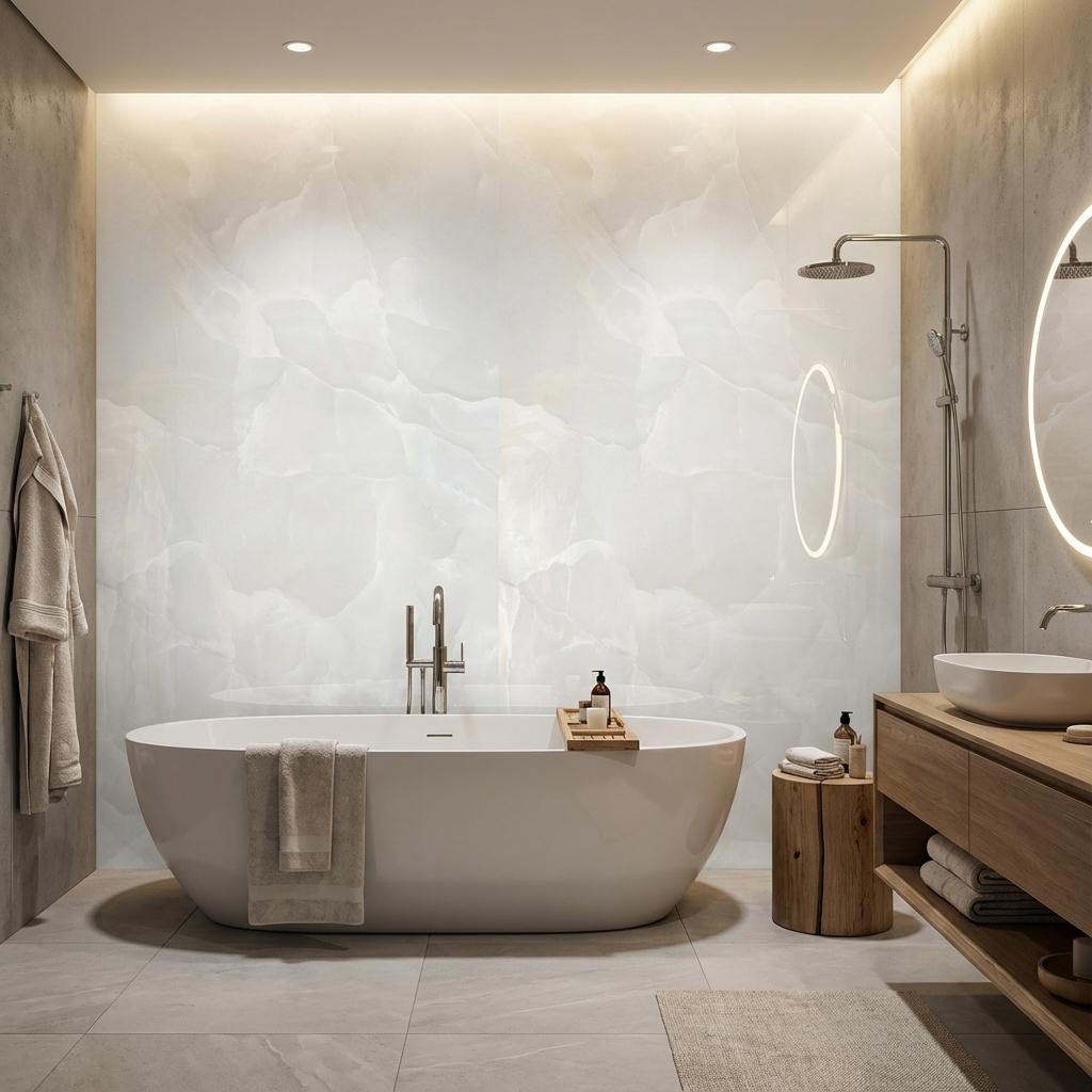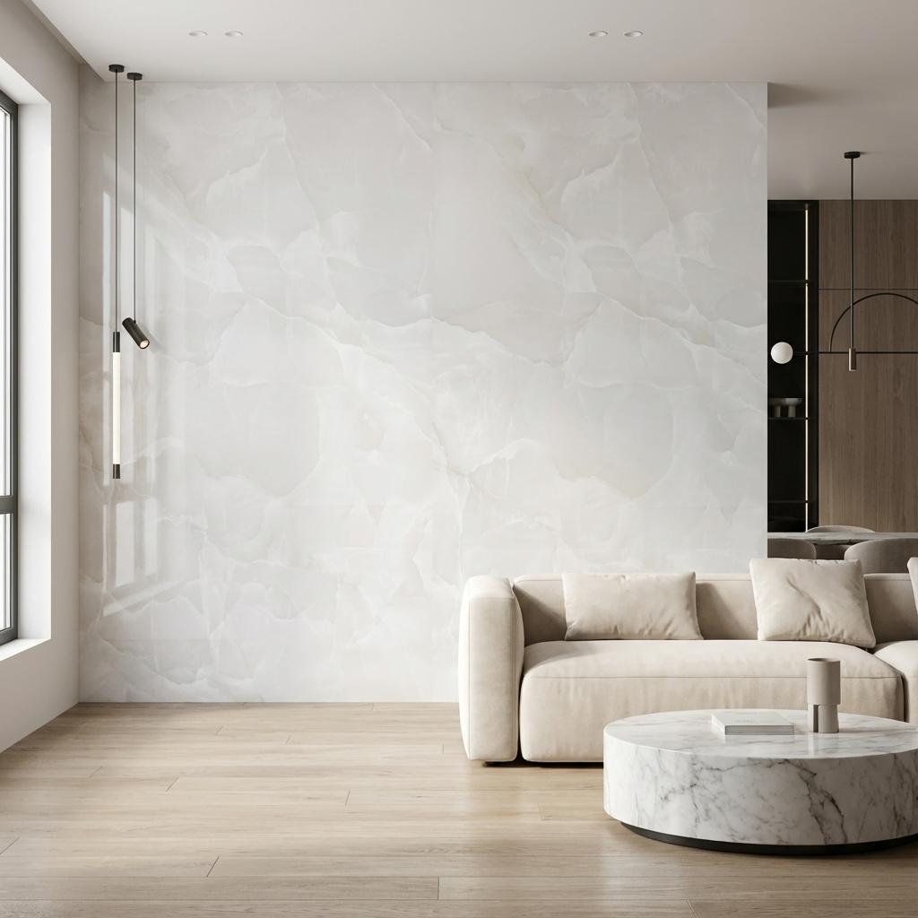 Cool white onyx evokes ancient temples with ethereal beauty. Gemstone elegance demanding respect. Made from refined clay, quartz/silica, and feldspar fired at high temperature to create a dense, low‑porosity body with color and pattern running through the entire thickness for superior wear and chip camouflage.