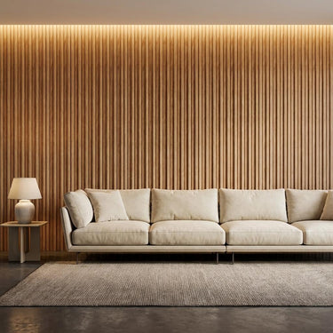 Louvers constructed with Polystyrene core and Wood, finished in matte Teak brown. Delivers a textured modern look suitable for accent walls.