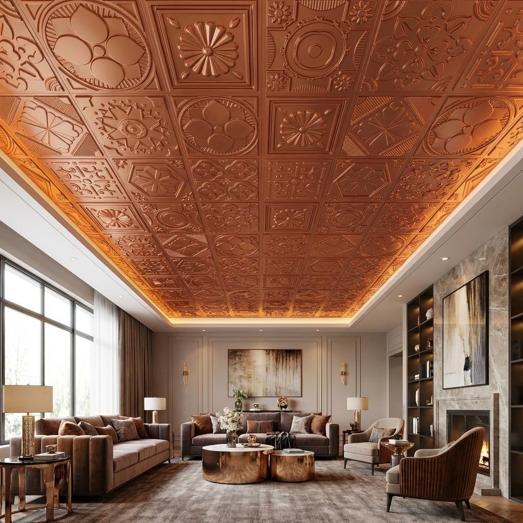 Steady Copper features luxurious metallic finishes for contemporary interiors. This sophisticated PVC ceiling panel combines stunning visual appeal with practical durability, using advanced printing technology to create authentic metallic effects with impressive depth. The glossy finish beautifully reflects light, perfect for modern elegance. Ideal for statement-making spaces, this panel delivers exceptional quality with water resistance, easy maintenance, and remarkable longevity.