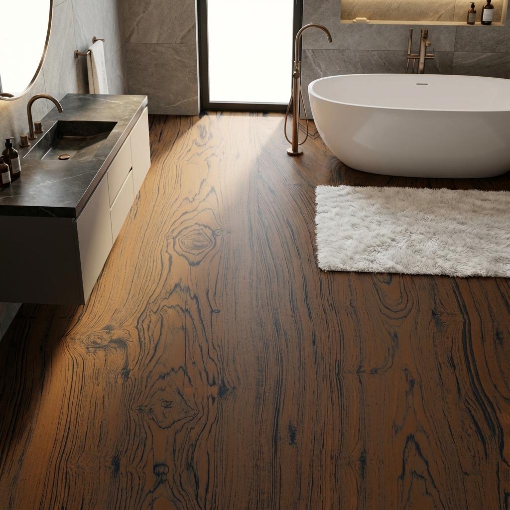 Deep wood aesthetic without susceptibility to time's wear. Rich grain preserved in robust, contemporary material. Made from refined clay, quartz/silica, and feldspar fired at high temperature to create a dense, low‑porosity body with color and pattern running through the entire thickness for superior wear and chip camouflage.
