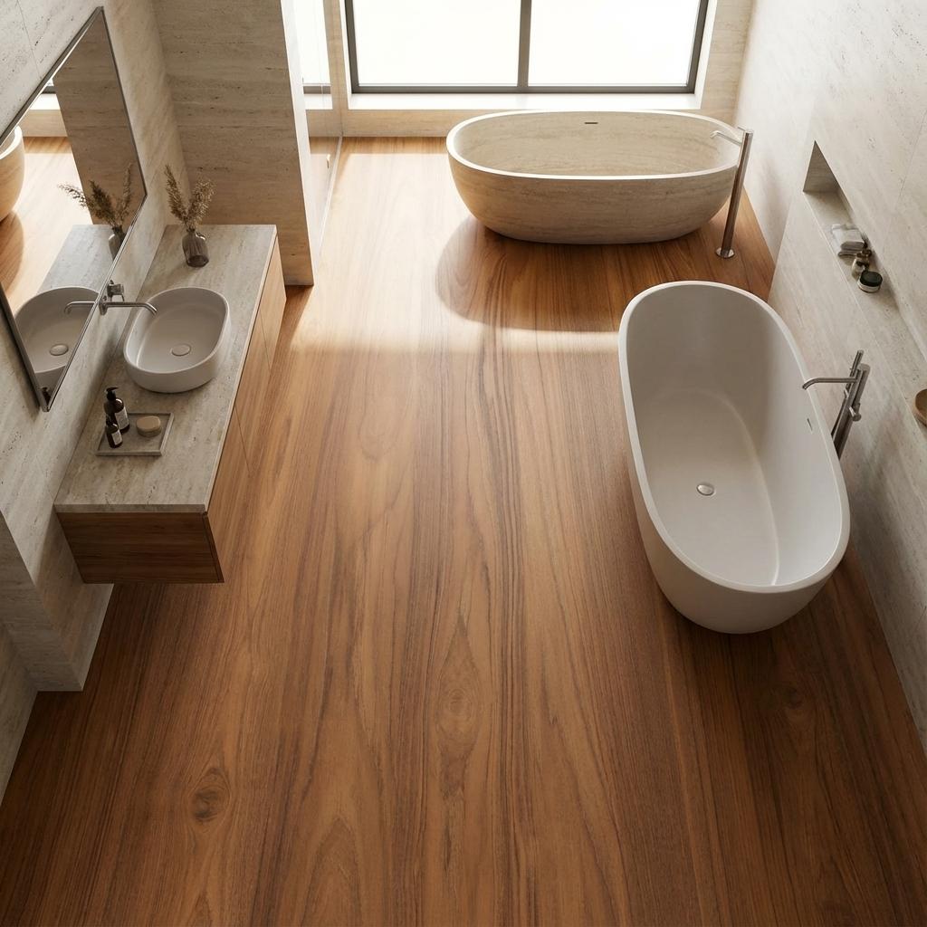 Deep wood aesthetic without susceptibility to time's wear. Rich grain preserved in robust, contemporary material. Made from refined clay, quartz/silica, and feldspar fired at high temperature to create a dense, low‑porosity body with color and pattern running through the entire thickness for superior wear and chip camouflage.