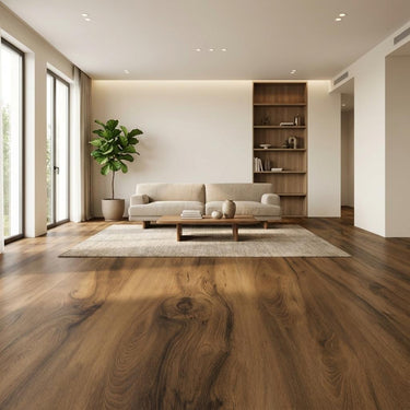 Deep wood aesthetic without susceptibility to time's wear. Rich grain preserved in robust, contemporary material. Made from refined clay, quartz/silica, and feldspar fired at high temperature to create a dense, low‑porosity body with color and pattern running through the entire thickness for superior wear and chip camouflage.