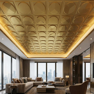 Uniform Brass features luxurious metallic finishes for contemporary interiors. This sophisticated PVC ceiling panel combines stunning visual appeal with practical durability, using advanced printing technology to create authentic metallic effects with impressive depth. The glossy finish beautifully reflects light, perfect for modern elegance. Ideal for statement-making spaces, this panel delivers exceptional quality with water resistance, easy maintenance, and remarkable longevity.