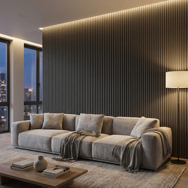 Louvers constructed with PVC core and Pastel - Grain, finished in matte Multi-colour. Delivers a textured modern look suitable for accent walls.
