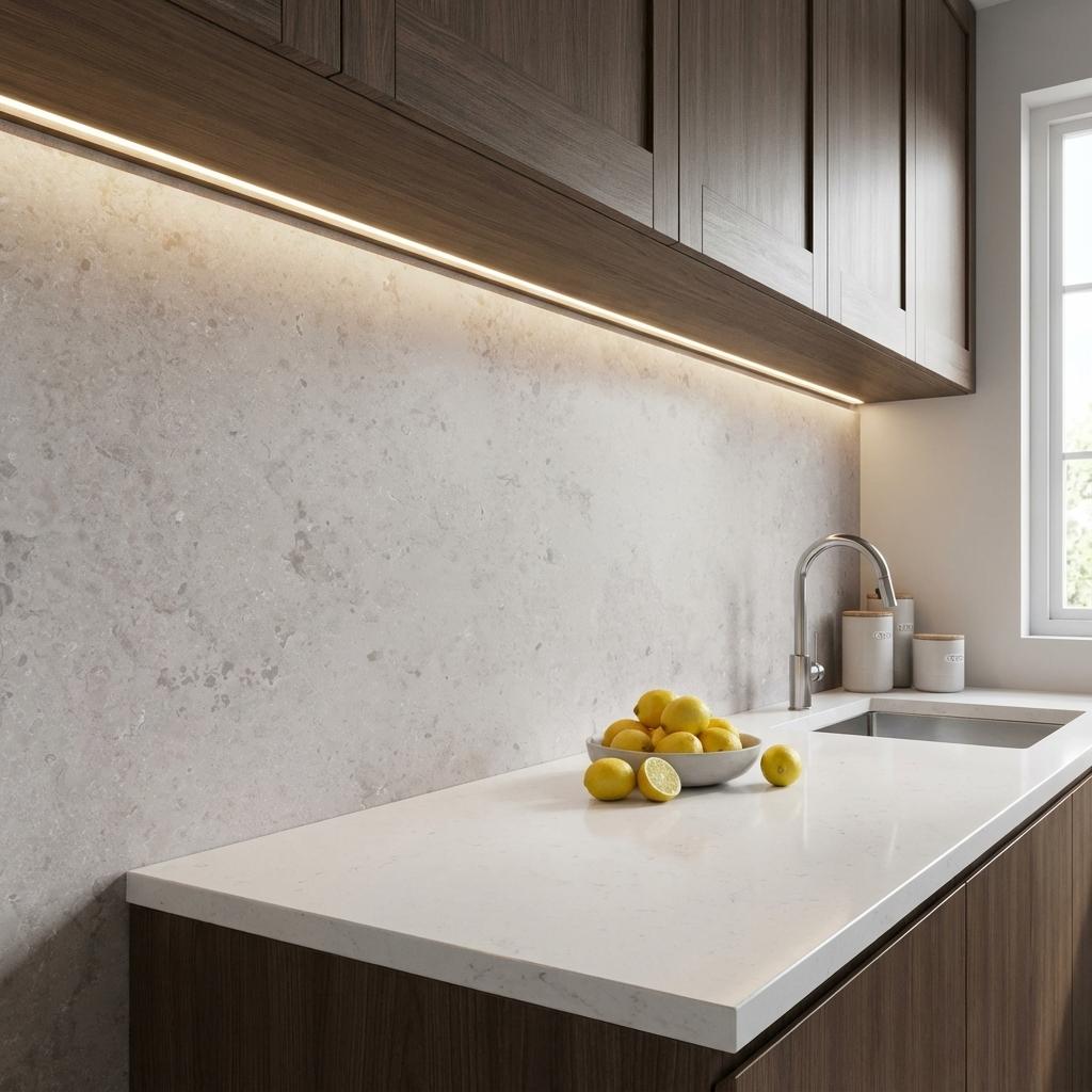 Cool light grey stone evokes timeless slate cliffs and rocky coastlines. Subtle texture suggesting geological heritage. Made from refined clay, quartz/silica, and feldspar fired at high temperature to create a dense, low‑porosity body with color and pattern running through the entire thickness for superior wear and chip camouflage.